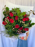 Christmas 'Ruby Red' blooms in our signature red rose bouquet. Make a wonderful festive gift for a loved one or a lovely addition to your home. En masse local roses bring festive elegance in this beautiful Christmas bouquet bursting with festive charm.
